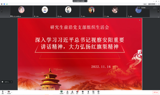 为深入学习贯彻党的二十大精神和习近平总书记视察河南安阳重要讲话精神,11月16日晚,研究生前沿党支部通过线上腾讯会议的形式,以“深入学习习近平总书记视察安阳重要讲话精神,大力弘扬红旗渠精神”为主题召开专题组织生活会,党支部全体党员、预备党员参加学习交流。