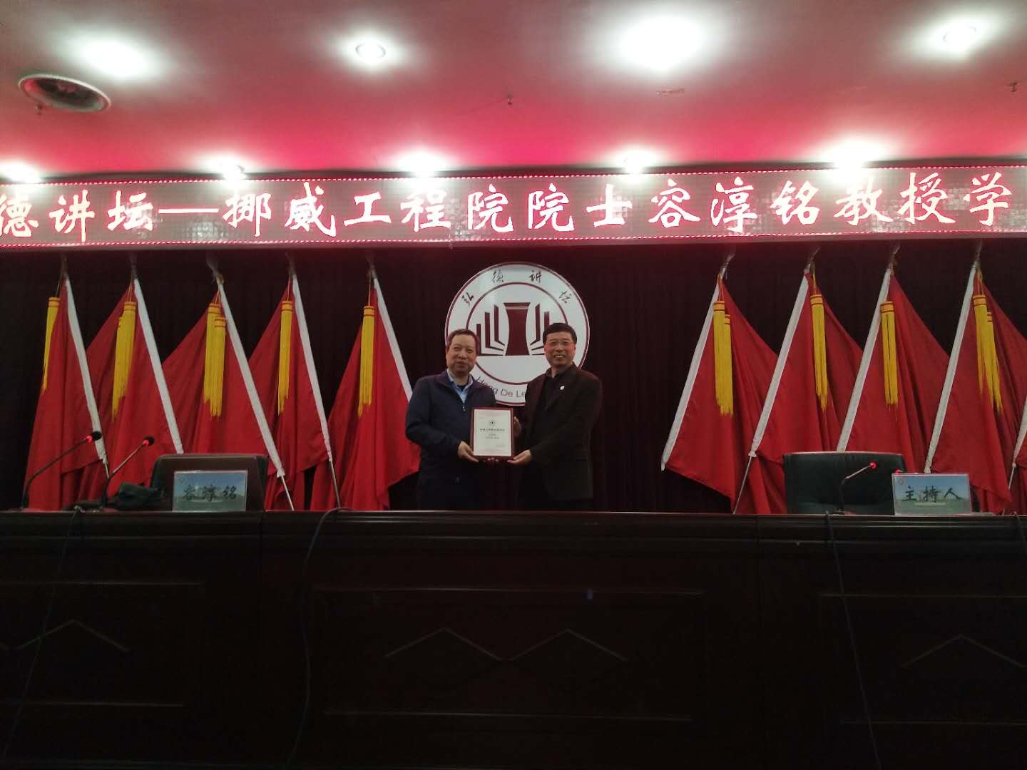 前沿信息技术研究院、计算机学院、电子信息学院、软件学院的师生聆听了报告。刘洲峰副校长为容淳铭院士颁发了弘德讲坛主讲证书,科技处副处长郑慧凡主持报告会。