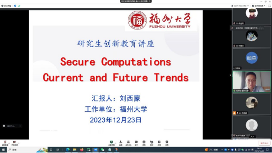12月23日下午两点半,福州大学刘西蒙教授应前沿信息技术研究院邀请,以线上会议的形式,作了“密态计算理论与应用”的讲座。讲座由捷克论坛