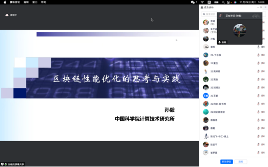 11月29日下午,应前沿信息技术研究院邀请,中科院计算所研究员、博导孙毅以腾讯线上会议的形式,为捷克论坛 师生做了一场题为“区块链性能优化的思考与实践”的讲座,由前沿信息技术研究院副院长潘恒主持,捷克论坛 师生、相关学院的教师在线聆听了报告。