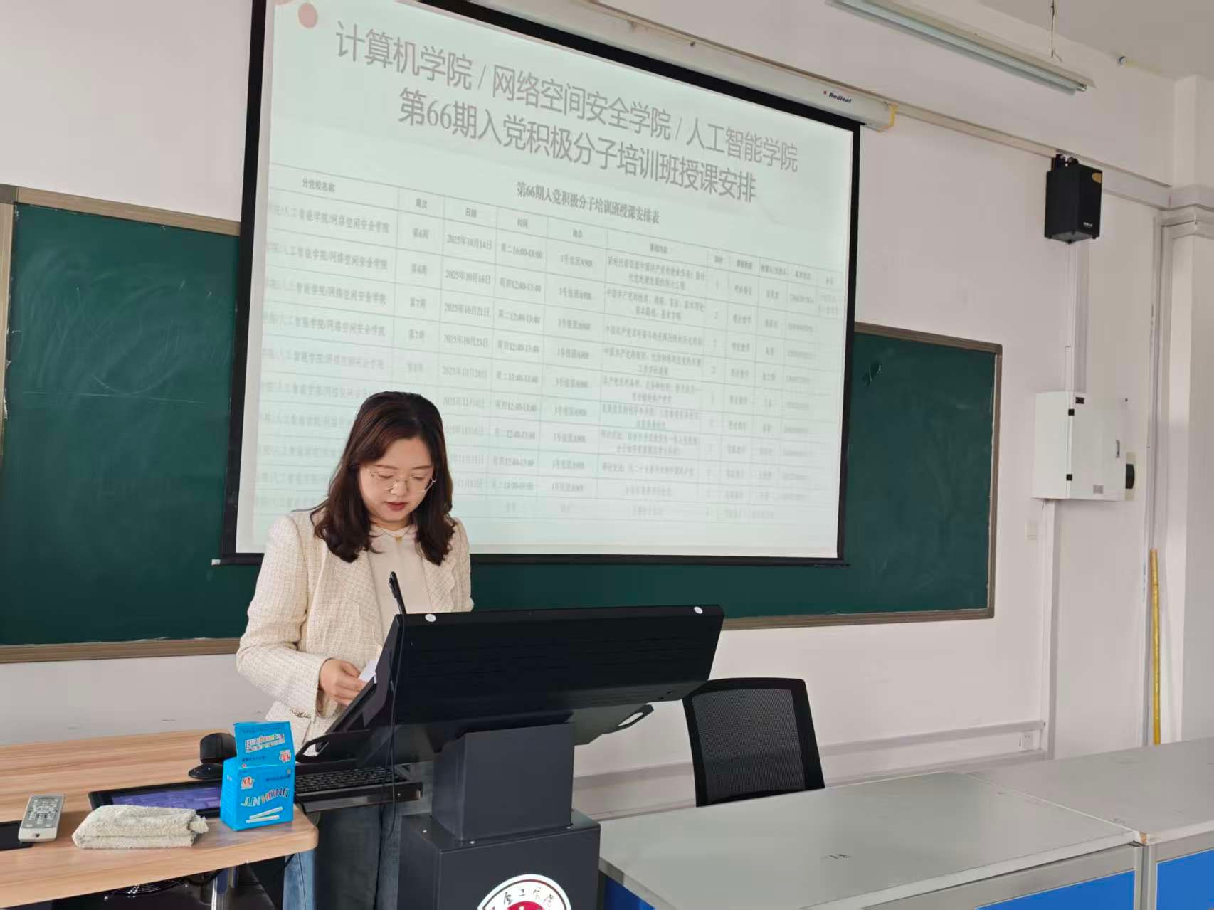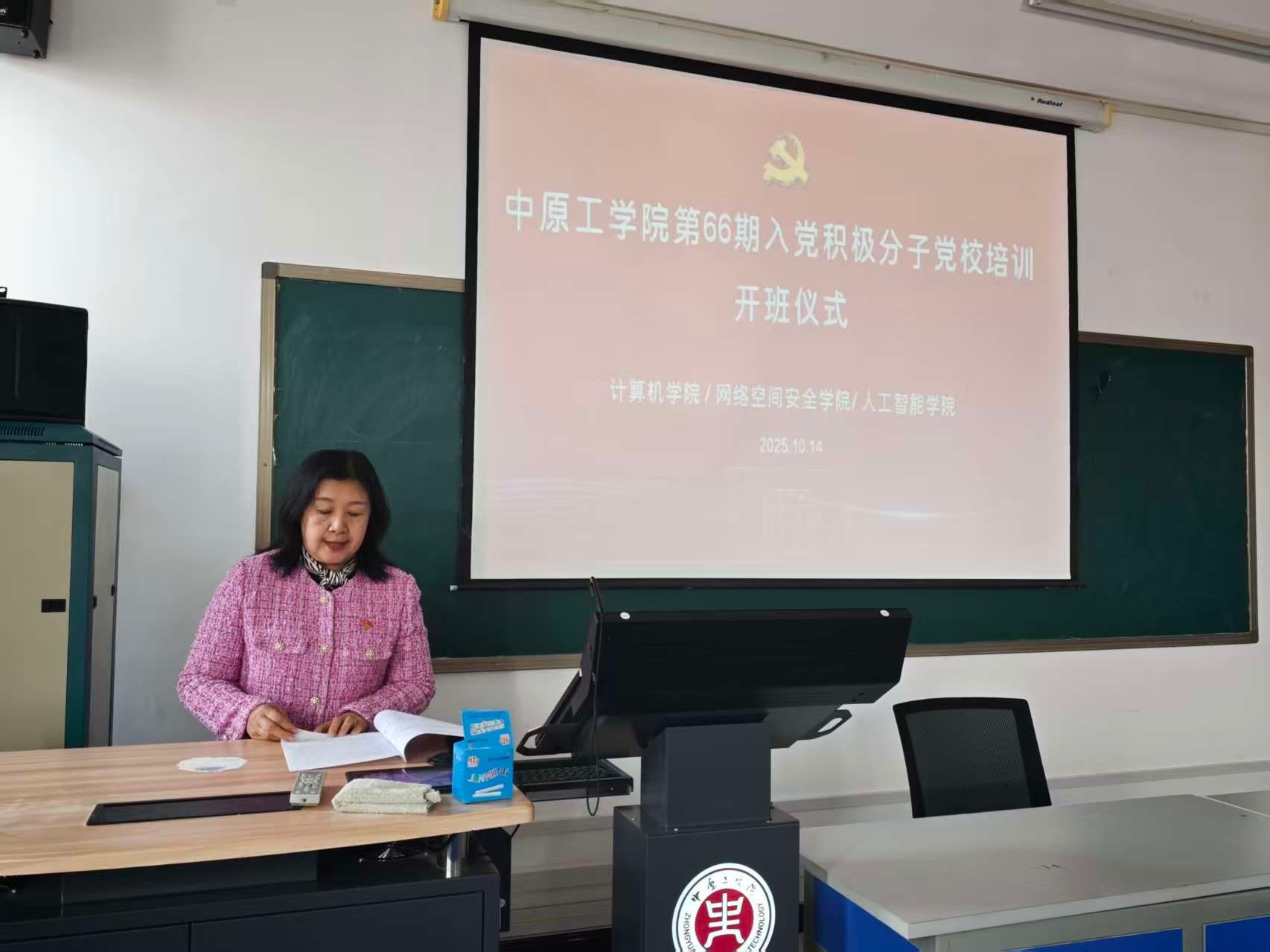 最后,人工智能学院直属党支部副书记张志鹏宣布计算机、网安、人工智能学院第66期入党积极分子党课培训班正式开班,希望学员们能够通过这次培训,筑牢理想信念,增强自身素养。本次开班仪式圆满结束,计算机学院党委书记苗凤君开始第一节集中授课,标志着本次党课培训集中学习正式开始。