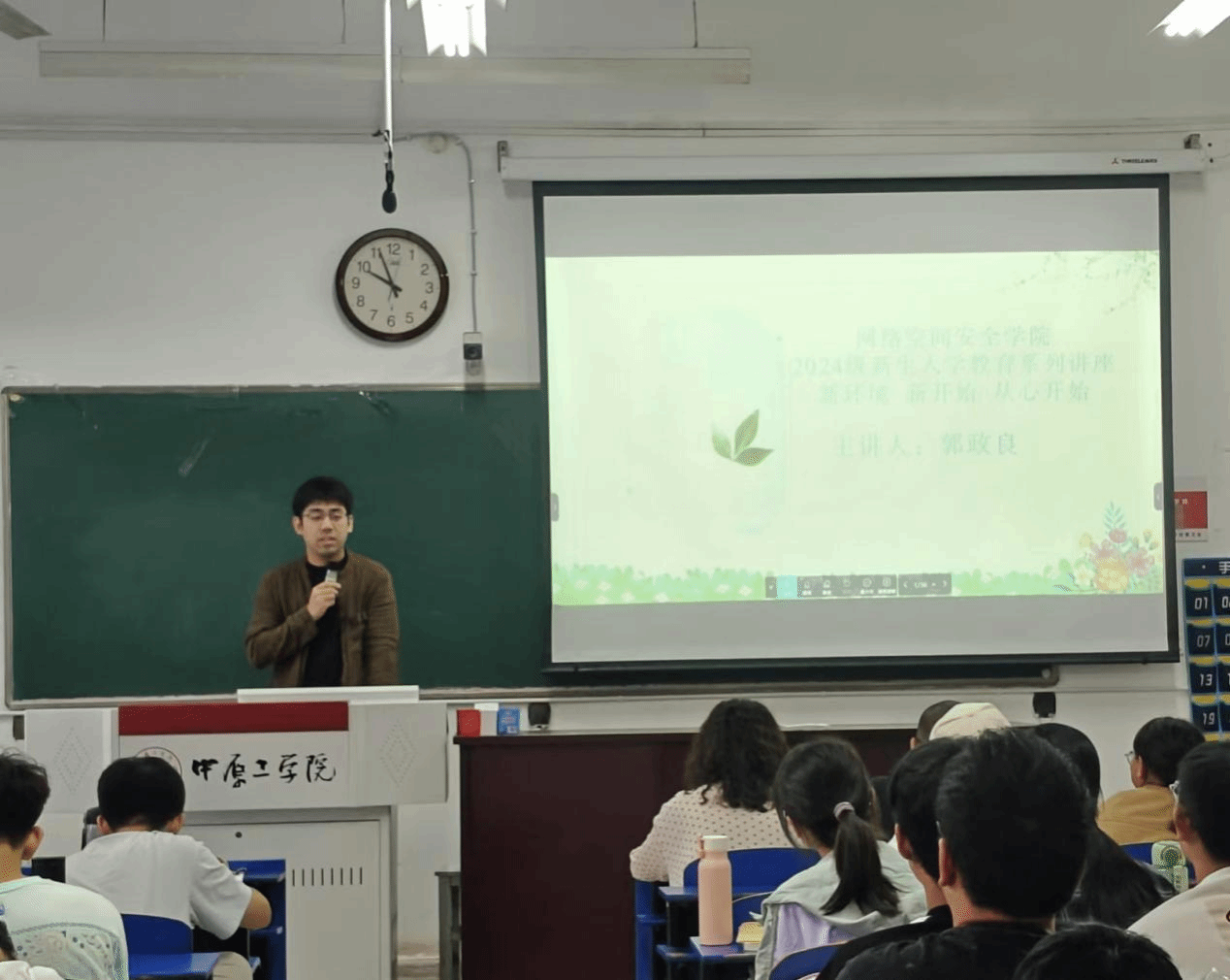 辅导员郭政良为新生讲述了心理健康相关的内容,详细介绍了大学生在适应新环境过程中可能遇到的心理挑战,如学习压力、社交难题和情感波动,并分享实用的解决方法。这为提升心理素质,塑造健康人格,引导新生培养良好的生活和学习习惯,正确面对大学中的挑战和压力打下了基础。