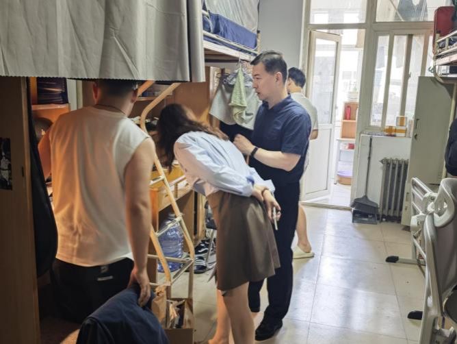 6月3日上午,学院党总支书记詹晋浩、副书记、副院长邢颖、学工办副主任郭政良及学生干部组成检查小组,对学生宿舍开展全面安全检查,重点排查违规电器、私拉电线、卫生死角等隐患。检查过程中与学生交流,观察其情绪状态,主动询问学习生活适应情况,了解睡眠质量、人际关系等,并给予同学们正向鼓励与支持。