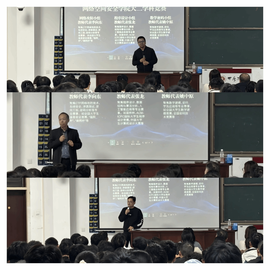 曲晓东老师及各小组教师代表围绕“阶梯式”学科竞赛培养体系,介绍了学院备赛资源与培训安排,涵盖CTF、程序设计、系统安全、数学建模与密码学应用等多个方向,鼓励同学们以赛促学、锤炼本领。张龙老师还开展了考研动员,引导学生树立考研目标,夯实专业基础。